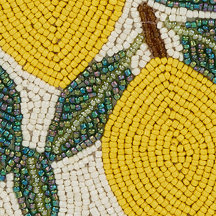 The DII Lemons Beaded Centerpiece Mat brings vibrant texture and seasonal charm to spring and summer tabletop assortments. Featuring intricate glass beadwork in a bold lemon motif, this decorative mat makes an eye-catching base for centerpieces, serving trays, or seasonal displays. A soft cotton backing protects table surfaces while adding stability. Perfect for brightening dining tables, entryways, or retail displays, this piece adds a cheerful, handcrafted touch to warm-weather merchandising and gift collections.