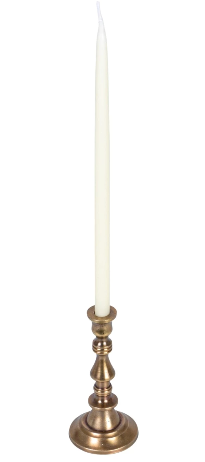 This elegant 2-1/4" round by 4-1/2" high taper holder is crafted from durable cast aluminum with a timeless antique brass finish. Designed to securely hold a 1/2" taper candle, it combines sturdy construction with classic style, making it a perfect accent for your home or special occasions. Elevate your décor effortlessly while ensuring reliable candle placement and safety.