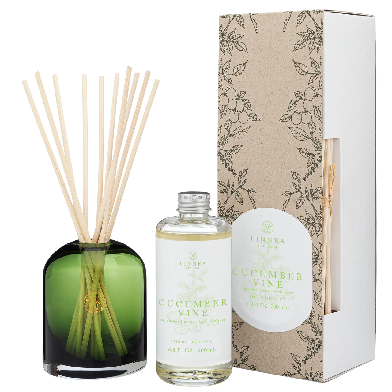 Introducing Cucumber Vine, the newest Botanik launch. Cool aqueous cucumber, verdant tendrils, and soft nasturtium petals create a refreshing garden moment. Hand-poured in moss green glass with clean soy wax and finished with a plantable seeded dust cover.