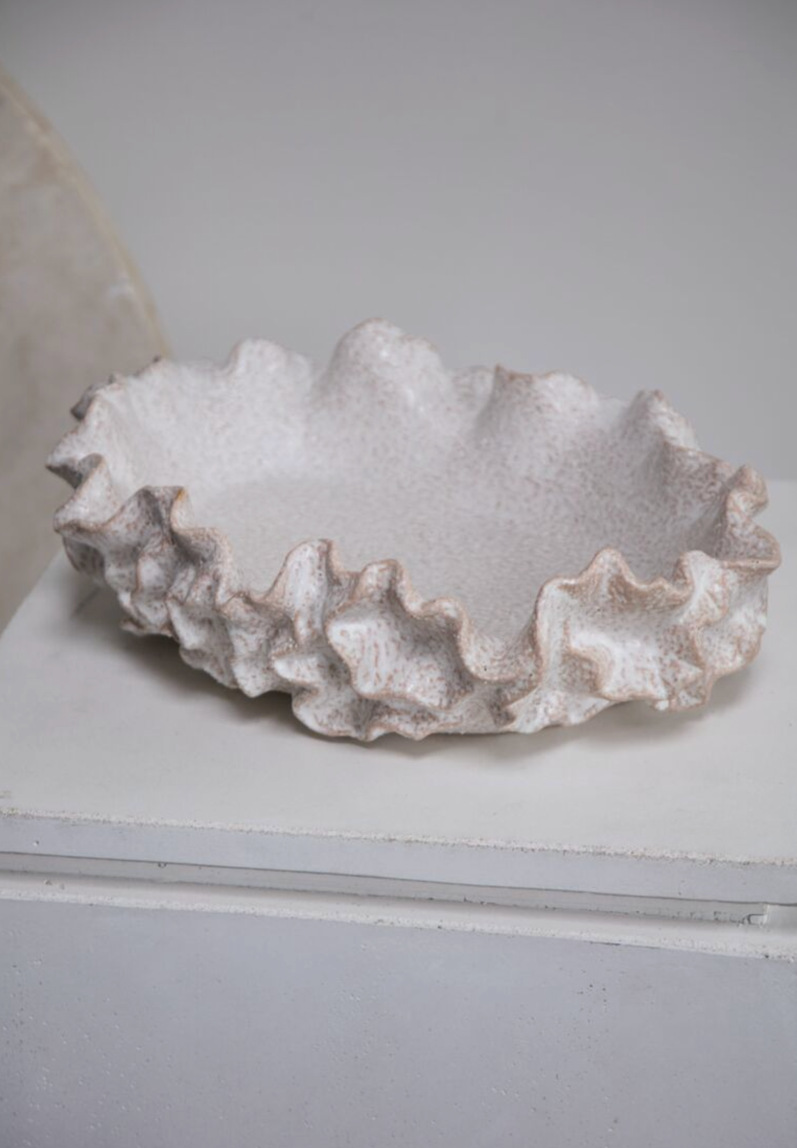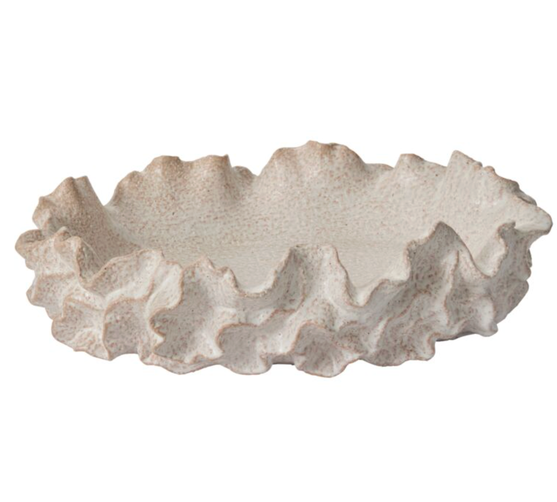 Your surfaces have never experienced the dimensional, textural wonder of the large-scale ceramic Sylvia Bowl. This shallow oblong bowl features an organic ruffled exterior & slightly sandy tone & surface. Fill with decorative bowl fillers or display on its own in the center of a console, large coffee table, or dining table as a dynamic accent piece.