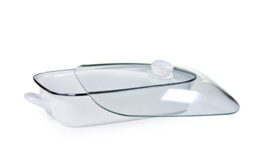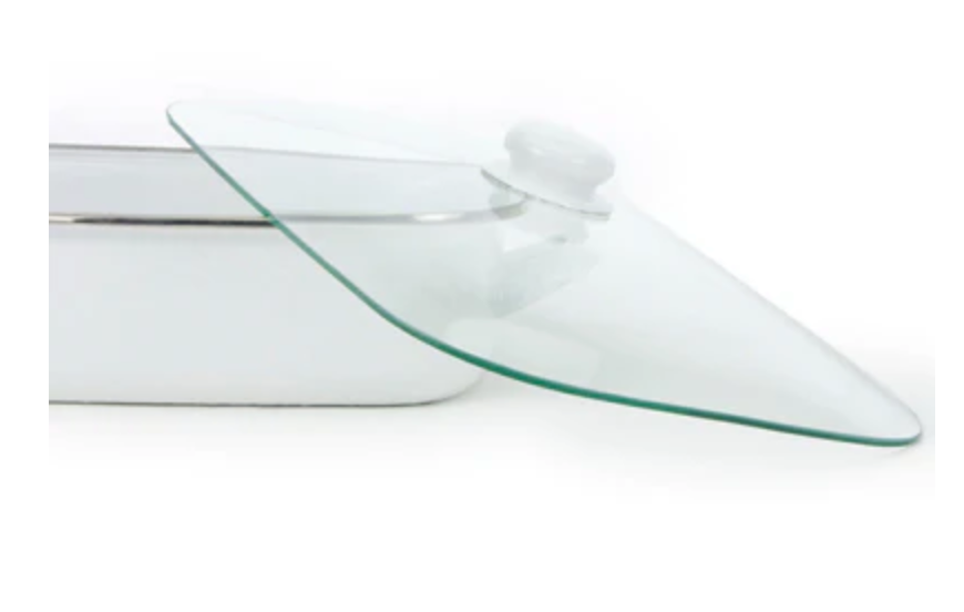 10.5qt capacity with tempered glass lid 16" x 12.5"x 4" dimensions