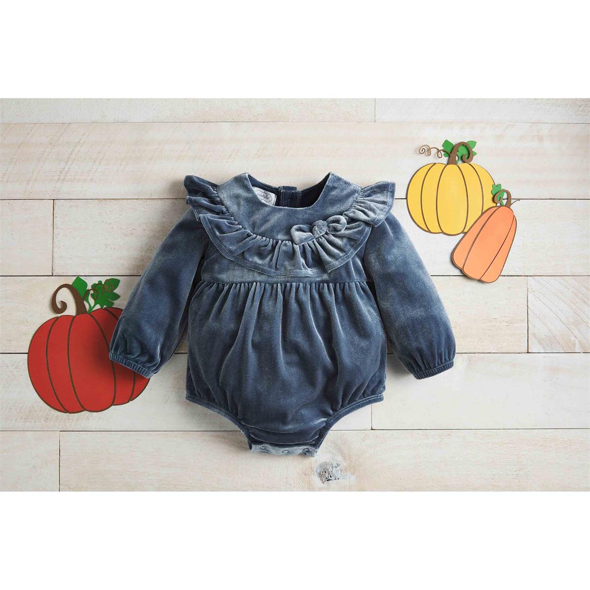 Velvet ruffle long sleeve bubble with tacked bow. Inner leg snap closure.