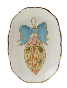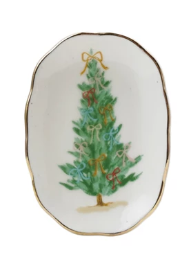 Add a touch of festive charm to your table with this playful 3" x 2" stoneware dish. Featuring a delicate scalloped edge highlighted by shimmering gold electroplating, each piece showcases a unique holiday design by artist Emily Little. Perfect for serving small treats or as a decorative accent, this multi-color dish brings warmth and cheer in three delightful styles.