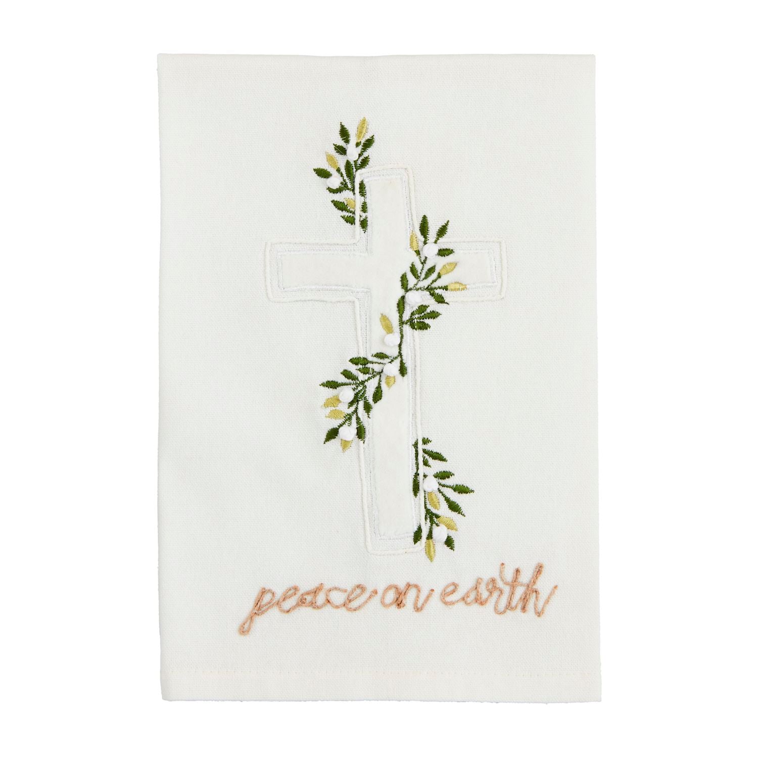 Cotton hand towel features velvet appliqué with French knot embroidery.