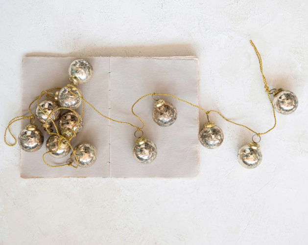 This festive garland features an array of etched mercury glass ball ornaments with snowflakes strung together with a gold cord. Add a touch of festive whimsy to any space with our enchanting collection of garlands, including stunning glass, sleek metal, and delightful mixed-material options, all expertly crafted to create a merry and bright atmosphere.
