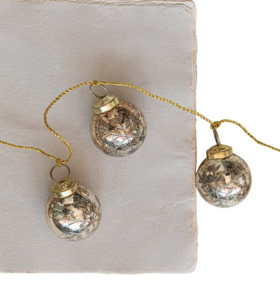 72"L Etched Mercury Glass Ball Ornament Garland w/ Snowflakes, Antique Gold Finish