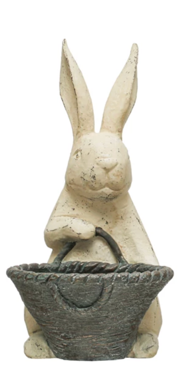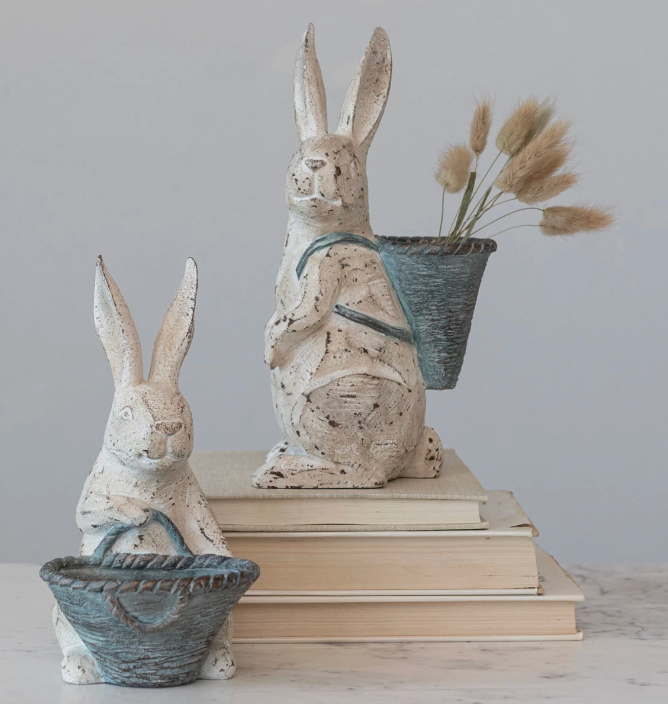 Bring whimsy, nostalgia, sophistication, or any desired ambiance to a living space with the simple addition of a figure or figurine. This cottage-inspired set of figurines features two silhouettes of rabbits with baskets in a distressed finish.